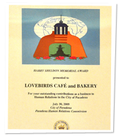 City of Pasadena, Pasadena Human Relations Commission has awarded Lovebirds Café & Bakery℠ with the Harry Sheldon Memorial Award for outstanding contributions as a business to Human Relations.Harry Sheldon Memorial Award